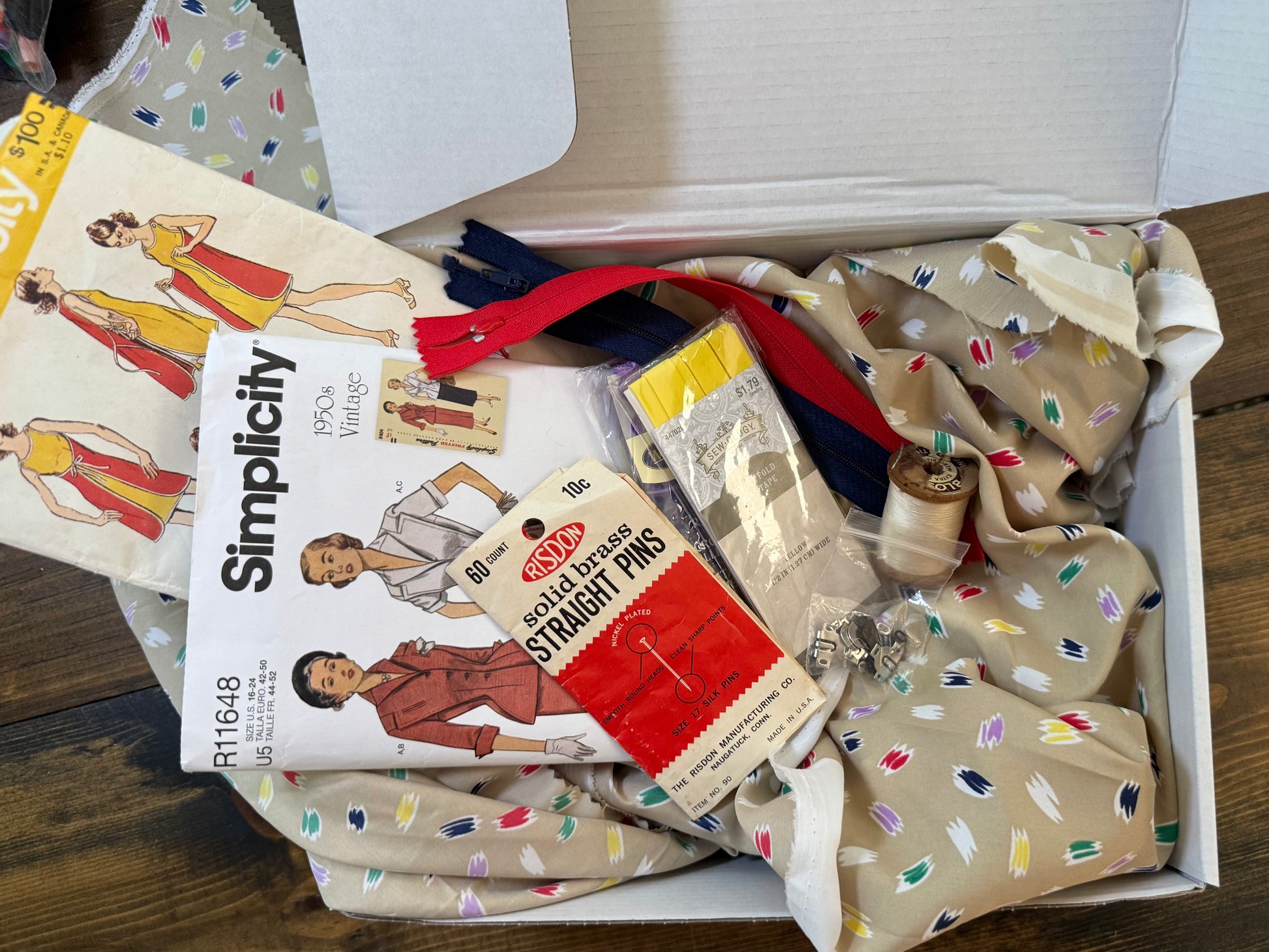 You get one box filled with garment sewing supplies. There’s no telling what’s inside! Vintage patterns? Maybe. Fabric? Obviously. Tools? Probably. Mix up your sewing game with a surprise box full of supplies!